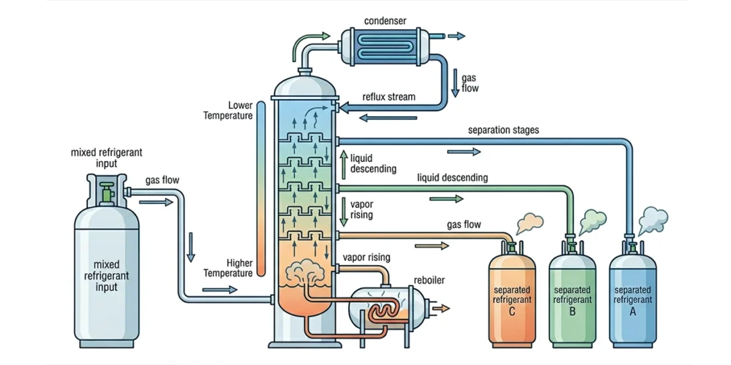 Refrigerant separation relies on fractional distillation — the same thermodynamic principle used in petroleum refining, chemical processing, and even beverage alcohol production. The concept is straightforward: every pure substance has a specific boiling point. When you heat a mixture of substances, the one with the lowest boiling point evaporates first. By capturing that vapor and condensing it separately, you isolate one component from the mixture.